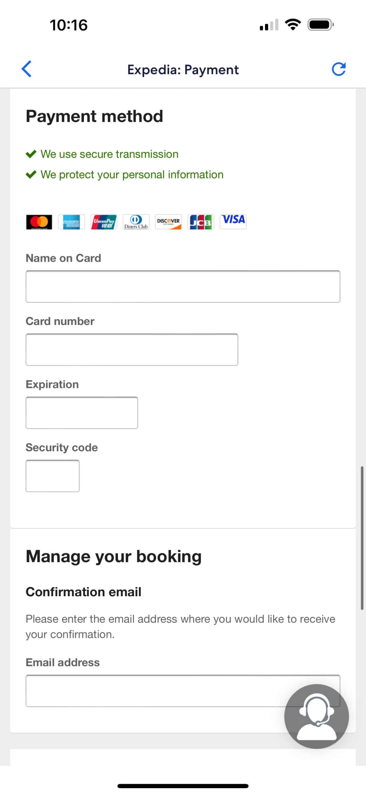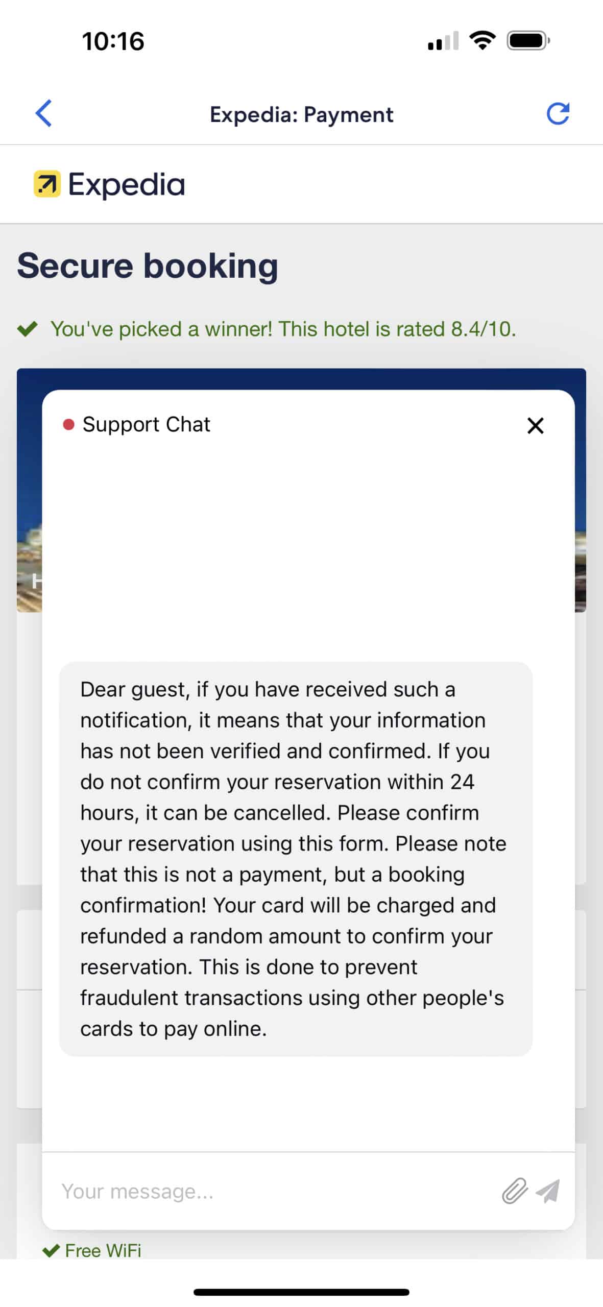 • As you can see in Image 1, the support chat automatically pops up and reiterates what the initial message said. It then claims your card will be refunded a random amount to confirm payment. However, as shown in Image 4 of the official Expedia app, the help agent icons are completely different. When clicking the help agent, you should also be first connected to a virtual agent with commonly asked questions options.