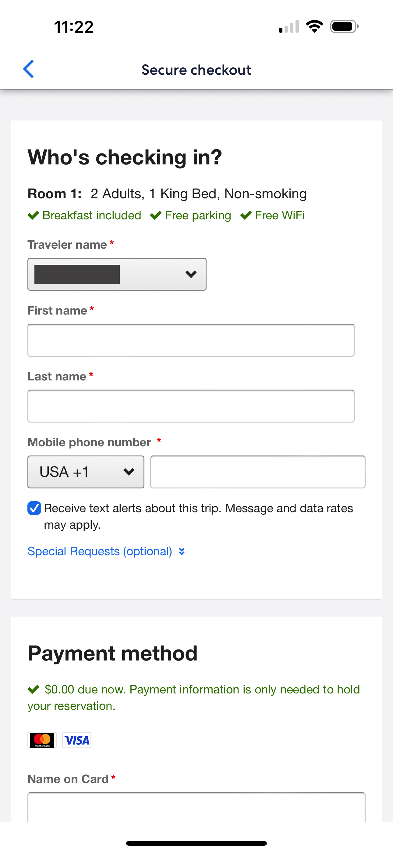 • No dropdown with your saved traveler profile information.